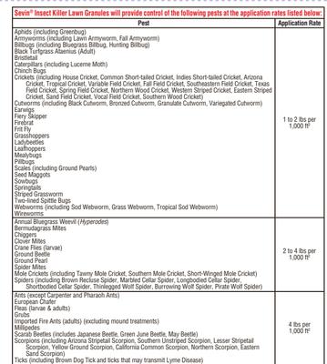 Sevin® Insect Killer Lawn Granules - GardenTech.com When insect pests or their damage appear in your lawn or landscape, take control with a product you can trust. Easy-to-use Sevin ® Insect Killer Granules kill more than 100 insect pests by contact in lawns, home perimeters, and ornamental and edible gardens. Broadcast the granules at recommended rates to provide uniform coverage, and then water thoroughly to release the active ingredient. PDF Sevin Insect Killer Concentrate 32oz Label PDF - GardenTech product provides control of each pest as listed in the Pest Table (see page 6). MEASURING INSTRUCTIONS • Shake well before use. • Remove measuring cap and fill cap according to chart below. • Pour into sprayer and add corresponding amount of water. Fl. Oz. of Sevin® Insect Killer Concentrate 1 2 4 6 8 Amount of Water 1 Quart (32 oz) ½ Gallon (64 oz)