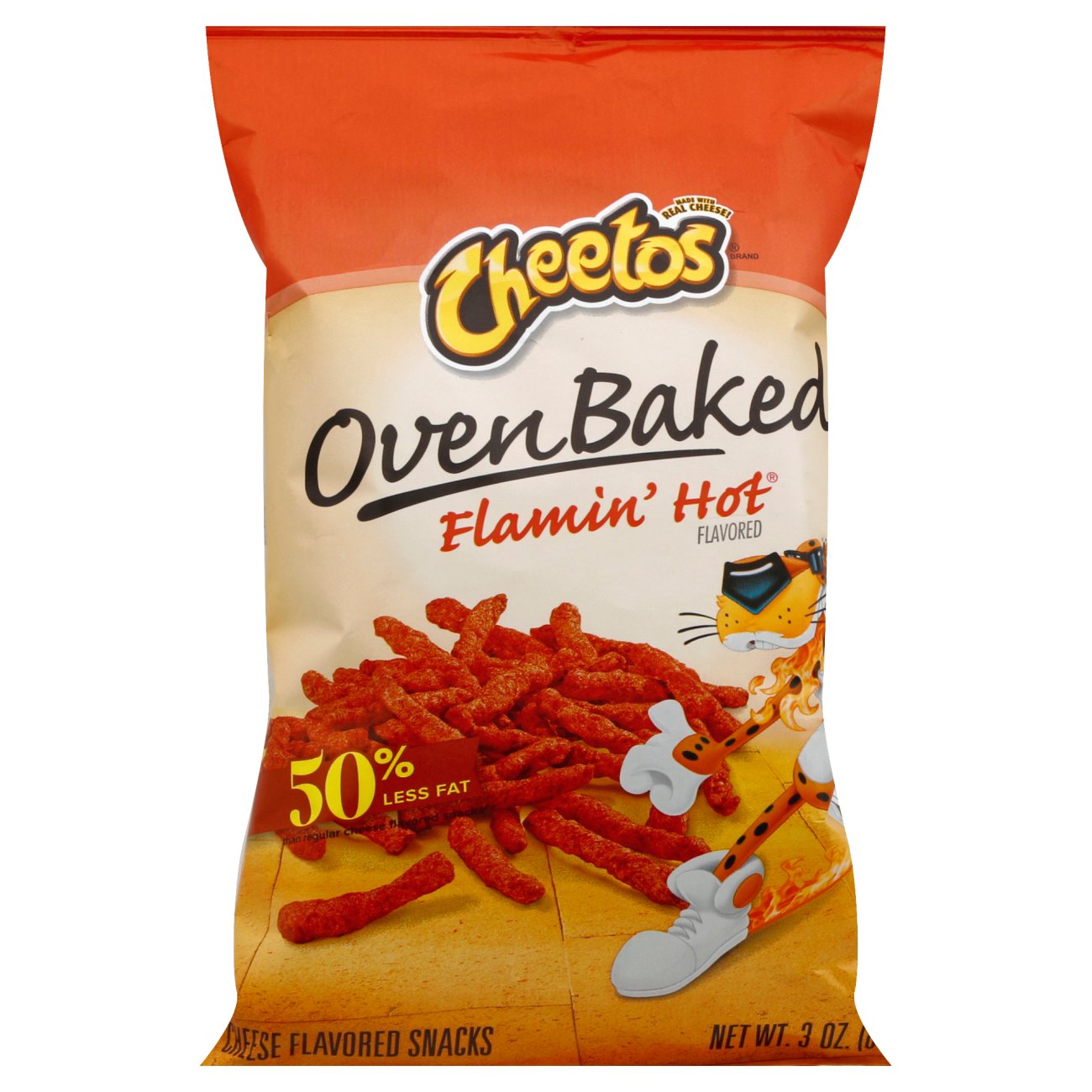 Calories in Cheetos Baked! Cheetos Flamin Hot and Nutrition Facts Cheetos Flamin Hot Nutrition Facts Serving Size 1 package (25.8 g) Amount Per Serving Calories 120 % Daily Values* Total Fat 4.50g 6% Saturated Fat 0.500g 3% Trans Fat 0.000g Polyunsaturated Fat 2.500g Monounsaturated Fat 1.000g Cholesterol 0mg 0% Sodium 190mg 8% Total Carbohydrate 18.00g 7% Dietary Fiber - Sugars 0.00g Protein 2.00g Vitamin D -