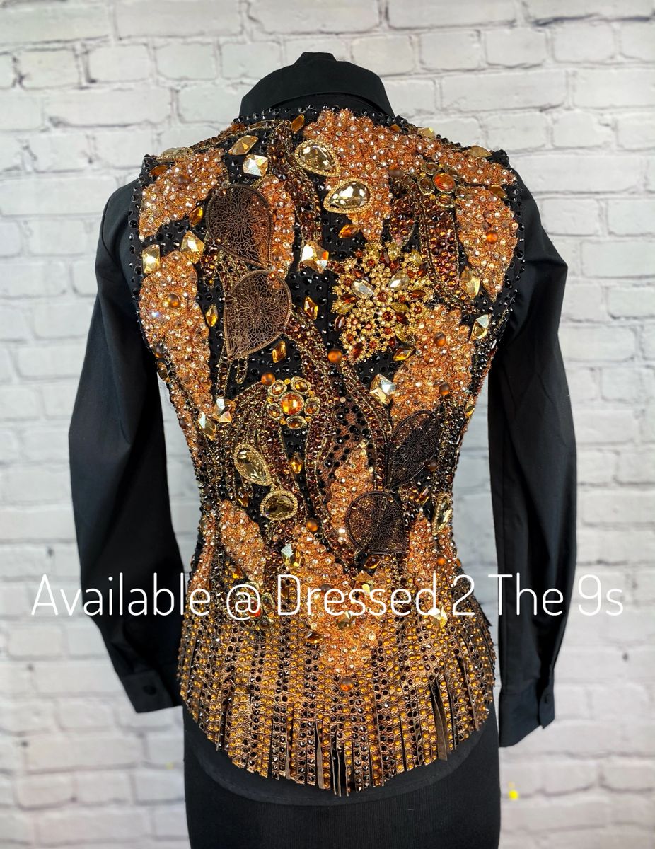 Apparel | Showgirls Apparel | Find Your Style Blue, Rust, Bronze & Black Vest Set Trudy Black Label . Item Number: 5847. Size: Small - Can let out to Medium. The synthetic-blend vest has slight stretch and measures approximately: 34"-35" Bust, 28"-29" Waist, 14" Shoulder to Shoulder and 24" (w/ 1" hem) Back Length. The side seams could be let out up to approximately: 3" through the entire ...