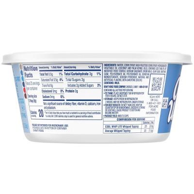 Homemade Cool Whip Recipe - Serious Eats Directions. Sprinkle gelatin over 1 ounce cold water (2 tablespoons; 28g) in a small bowl and stir with a fork to combine. In another bowl, mix together milk, powdered milk, and vanilla until relatively smooth. In a 1-quart stainless steel saucepan, combine the remaining 2 ounces water (1/4 cup; 55g) with corn syrup, sugar, and salt and set ... Cool Whip 32 Oz Frozen Whipped Topping Original 4pk Club 4 Shrink ... COOL WHIP 32 OZ FROZEN WHIPPED TOPPING ORIGINAL 4PK CLUB 4 SHRINK WRAPPED INNER PACK My Food and Family . View All. Add a Recipe. Shopping List. Favorites. Register Login. Kraft User ... checkbox label label. checkbox label label. checkbox label label. Clear. checkbox label label. Apply Cancel. Confirm My Choices. Allow All. Cool Whip Whipped Topping Original Allergy and Ingredient Information We found 4 other products Made By Cool Whip that either contain or have been processed in a facility with 2 other TOP 14 allergens. Nutrition Label Nutrition Facts Serving Size 2.00 tbsp Servings Per Container Amount Per Serving Calories 25 Calories from Fat 15 % Daily Value* Total Fat 1.5g 2.3% Saturated Fat 1.5g 7.5% Trans Fat 0g Cholesterol 0g Cool Whip - Wikipedia Cool Whip is available in an aerosol can using nitrous oxide as a propellant. [14] From its introduction, Cool Whip was labeled and advertised as non-dairy, [15] but as of 2018 it contains skimmed milk and sodium caseinate, a milk derivative.