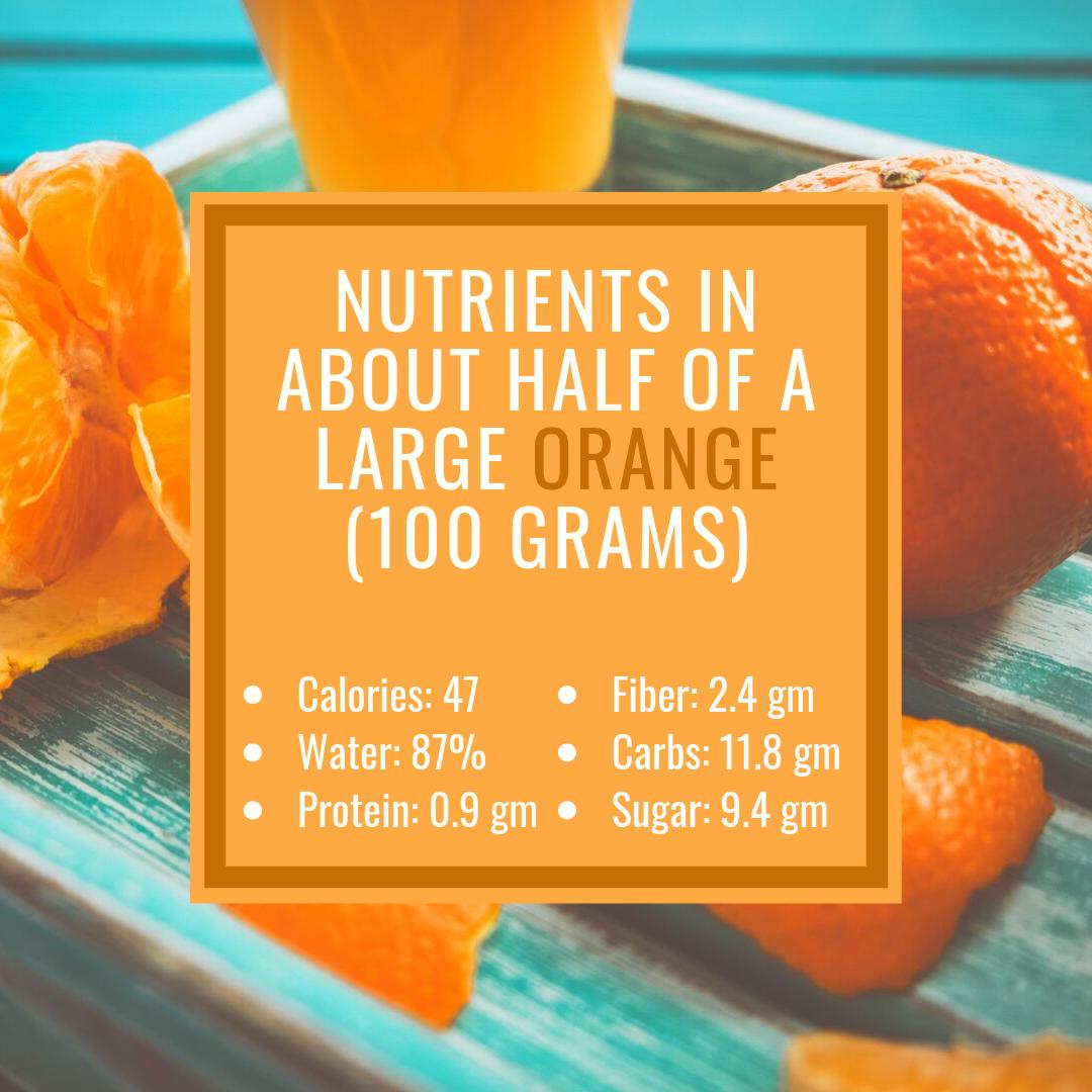 Oranges: Nutrition & Health Benefits - WebMD Nutrition in Oranges. One medium-sized orange has: 60 calories. No fat or sodium. 3 grams of fiber. 12 grams of sugar. 1 gram of protein. 14 micrograms of vitamin A. 70 milligrams of vitamin C.