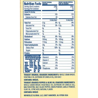 Nabisco Triscuit Original Crackers - Shop Snacks & Candy at ... Nabisco Triscuit Original Crackers ; Cholesterol 0mg, 0% ; Sodium 160mg, 7% ; Potassium 120mg, 2% ; Total Carbohydrate 20g, 7% ... 12 Best Healthy Crackers for Snacking 2022, According to ... Oct 19, 2020 · “When it comes to choosing a healthy cracker, the most important place to look is the ingredients label,” says Stefani Sassos, M.S., R.D.N., the Good Housekeeping Institute’s registered ... Triscuit Nutrition Facts. Calories, carbs, fat, sodium & more ... Get nutrition information for Triscuit items and over 200,000 other foods (including over 3,500 brands). Track calories, carbs, fat, sodium, sugar & 14 other nutrients. ... Triscuit Original Thin Crisps. 15 crackers (30g) Nutrition Facts. 130 calories. Log food: Triscuit Reduced Fat Crackers. 6 crackers (28g) Nutrition Facts. 110 calories. Triscuit Original Crackers Family Size 12.5 oz oz - SmartLabel™ Triscuit Original Crackers Family Size 12.5 oz oz Net wt. 12.5 oz 00044000051693 Nutrition Ingredients Allergens Features & Benefits Company, Brand & Sustainability 120 Calories 0 Sat Fat (g) 160 Sodium (mg) 0 Tot Sugars (g) Nutrition Facts About 13 Servings Per container Serving Size 6 crackers (28g) Amount Per Serving Calories 120 % Daily Value *