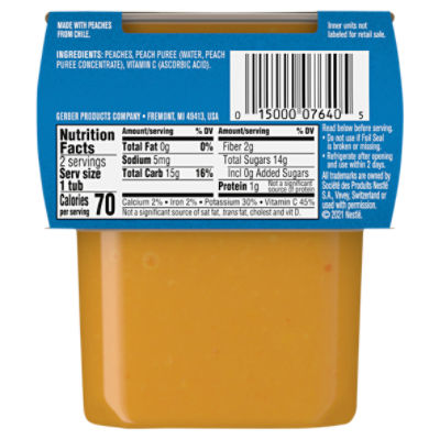 Products - Gerber.com Gerber prides itself on offering nutritious products that help meet the needs of children—from infancy through 4 years of age. The Gerber ® Start Healthy, Stay Healthy™ Nutrition System is a stage-based nutrition system of products, education and easy to use tools and resources to promote the early establishment of healthy eating habits. Gerber Nutrition Facts. Calories, carbs, fat, sodium ... - MyFoodDiary Get nutrition information for Gerber items and over 200,000 other foods (including over 3,500 brands). Track calories, carbs, fat, sodium, sugar & 14 other nutrients. ... Gerber Peach Mango Baby Food w/ Oatmeal Cereal 2nd foods. Sitter. 1 pack (113g) Nutrition Facts. 80 calories. Log food: Gerber Mango Apple Twist Baby Food 2nd foods. Sitter. Shop Baby Food Purees - Gerber Gerber 2nd Foods Pear Baby Food tub This product is currently out of stock. 2nd Foods® Cereals Apple Banana with Oatmeal (Single) 4 oz 2pk Tubs $1.62 Growing better, for a better future. Climate Forward Nutrition is our commitment to nourish our environment and everything that comes from it for our little ones. A Day in Your Supported Sitter's Diet Gerber Peaches Baby Food - 2 ea, Nutrition Information | Innit 12 · Sugar. 24% ; Protein. 2.174% ; Total Fat. 0% ...