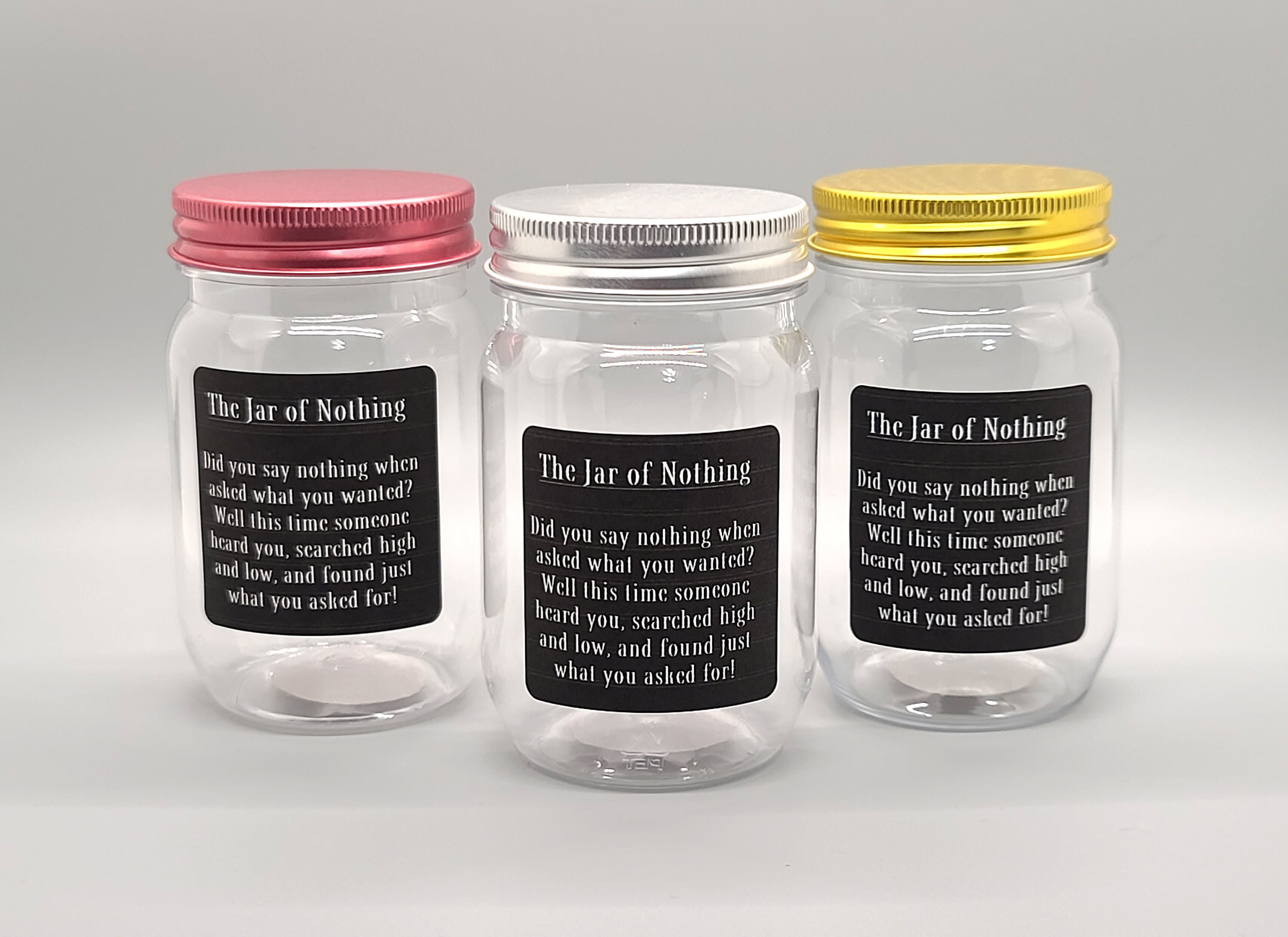 A Jar of Nothing A Nothing Jar Gag Gift | Etsy | Best gag gifts, Gag ... Jul 18, 2021 - A Jar of Nothing is exactly that. It is what you asked for and it is what you received. Order one of these for the special someone who always answers NOTHING when asked what they want for their Birthday, Anniversary or even Christmas. Have another idea, ask us to print your NOTHING jar day, just
