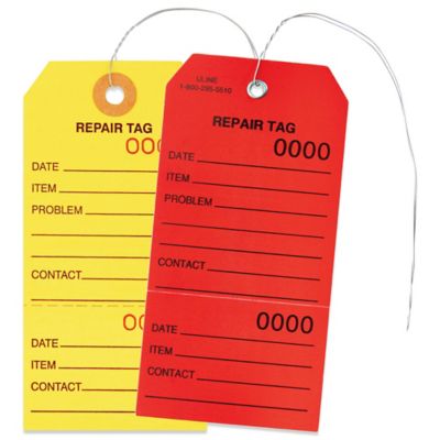 50 Uline Repair Tags Pre-Wired & Numbered - Red S-7220RPW 150 Uline Repair Tags Pre-Wired & Numbered - Red S-7220RPW. $28.99. Free shipping. 50 Uline Inventory / Shipping Tags Pre-Strung Heavy Duty Manila S-931PS. $13.99. Free shipping. 50 Uline Repair Tags Pre-Wired & Numbered - Yellow S-7220YPW. $15.99. Free shipping.