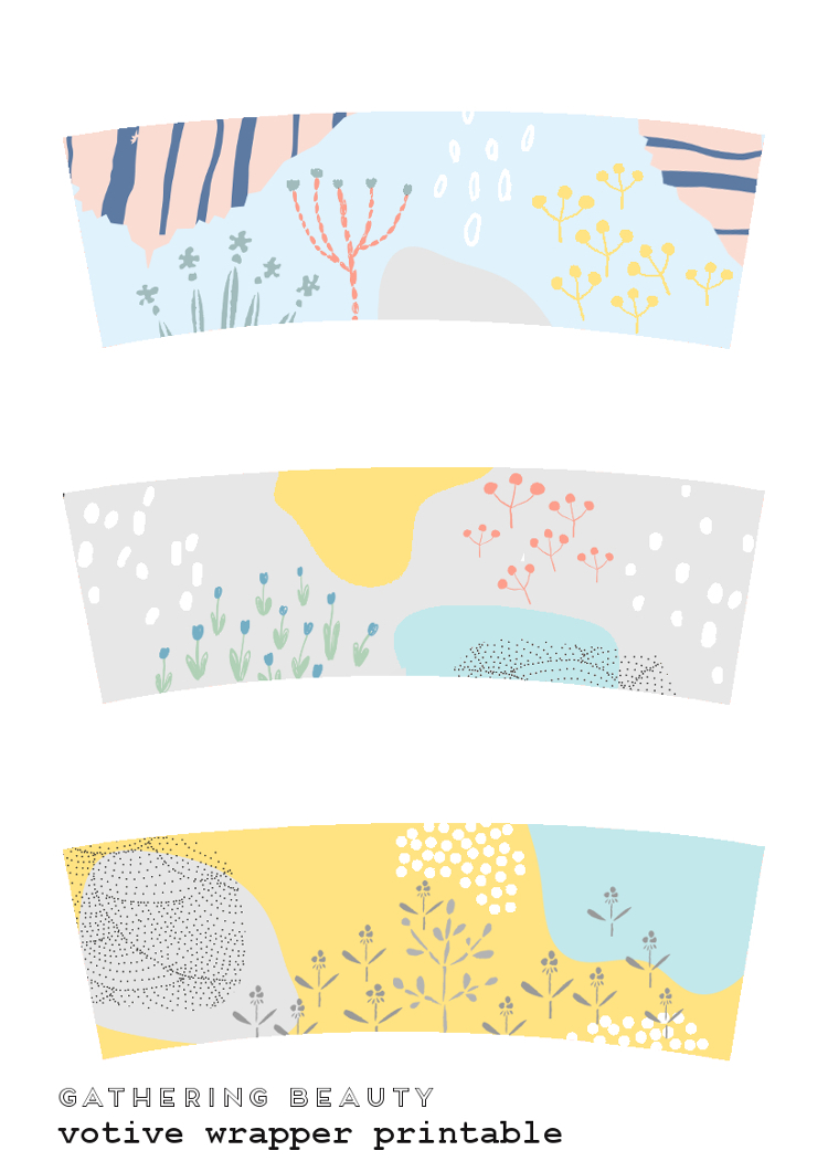 PRINTABLE VOTIVE CANDLE WRAPS — Gathering Beauty Double-sided Tape Step 1: Download and print out the printable votive candle wraps pdf. Step 2: Cut out each of the wraps. Step 3: Stick some double-sided tape to the end and wrap around your votive. There's so many uses for these pretty candles. Pop them on your coffee table or fireplace to add a lovely Summery touch to a room.